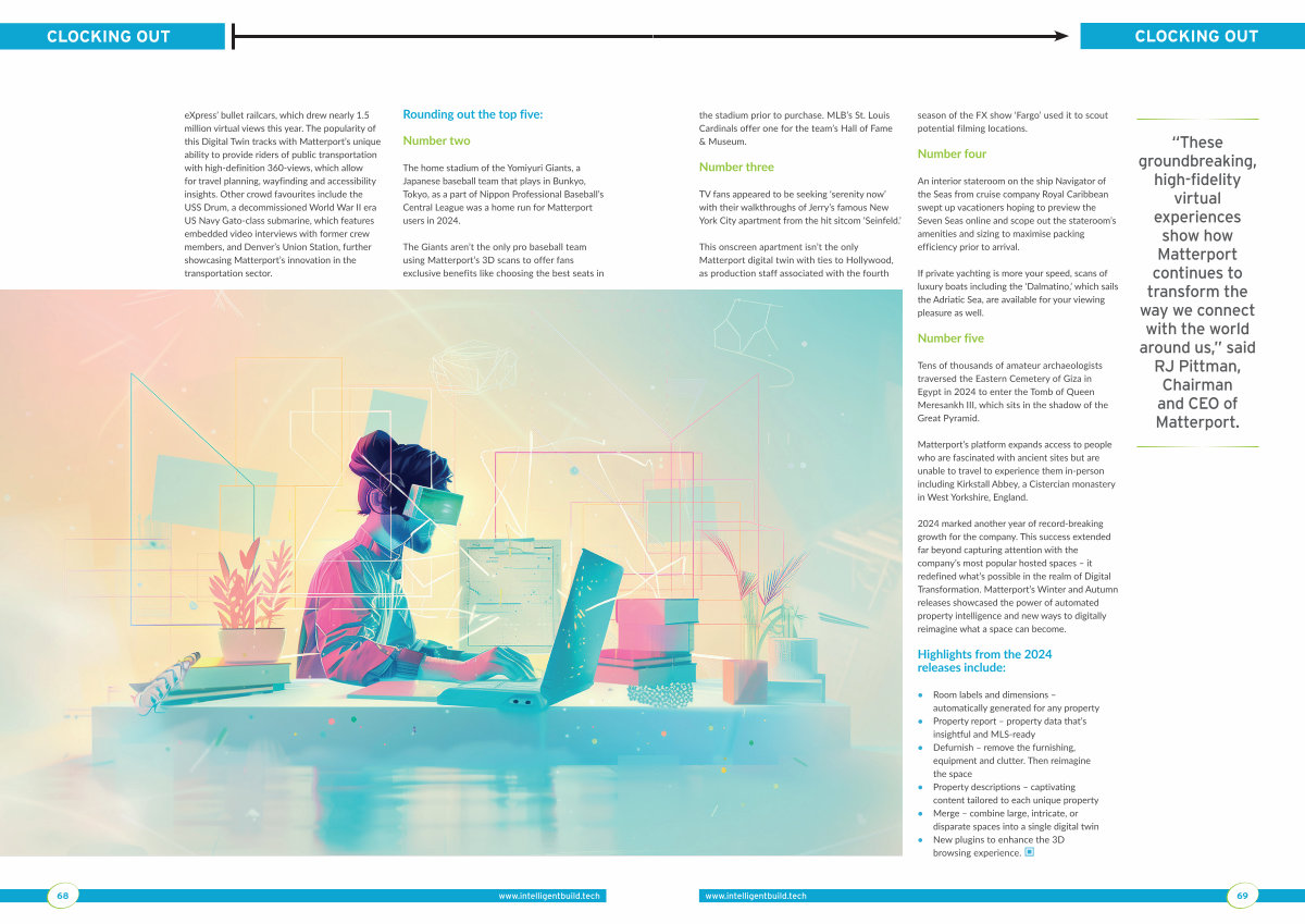 CLOCKING OUT eXpress ’ bullet railcars , which drew nearly 1.5 million virtual views this year . The popularity of this Digital Twin tracks with Matterport ’ s unique ability to provide riders of public transportation with high-definition 360-views , which allow for travel planning , wayfinding and accessibility insights . Other crowd favourites include the USS Drum , a decommissioned World War II era US Navy Gato-class submarine , which features embedded video interviews with former crew members , and Denver ’ s Union Station , further showcasing Matterport ’ s innovation in the transportation sector .
