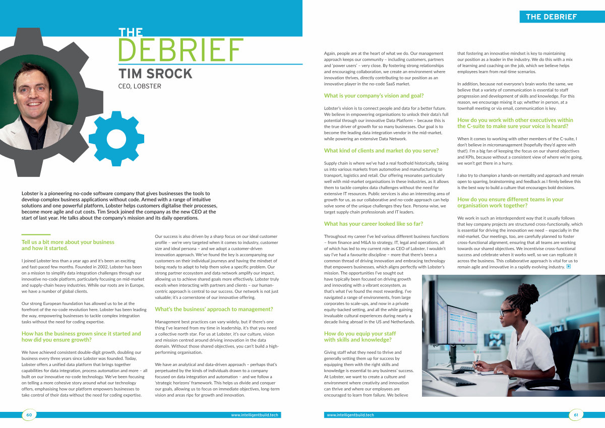 Throughout my career I’ ve led various different business functions – from finance and M & A to strategy, IT, legal and operations, all of which has led to my current role as CEO of Lobster. I wouldn’ t say I’ ve had a favourite discipline – more that there’ s been a common thread of driving innovation and embracing technology that empowers businesses, which aligns perfectly with Lobster’ s mission. The opportunities I’ ve sought out have typically been focused on driving growth and innovating with a vibrant ecosystem, as that’ s what I’ ve found the most rewarding. I’ ve navigated a range of environments, from large corporates to scale-ups, and now in a private equity-backed setting, and all the while gaining invaluable cultural experiences during nearly a decade living abroad in the US and Netherlands. that fostering an innovative mindset is key to maintaining our position as a leader in the industry. We do this with a mix of learning and coaching on the job, which we believe helps employees learn from real-time scenarios.