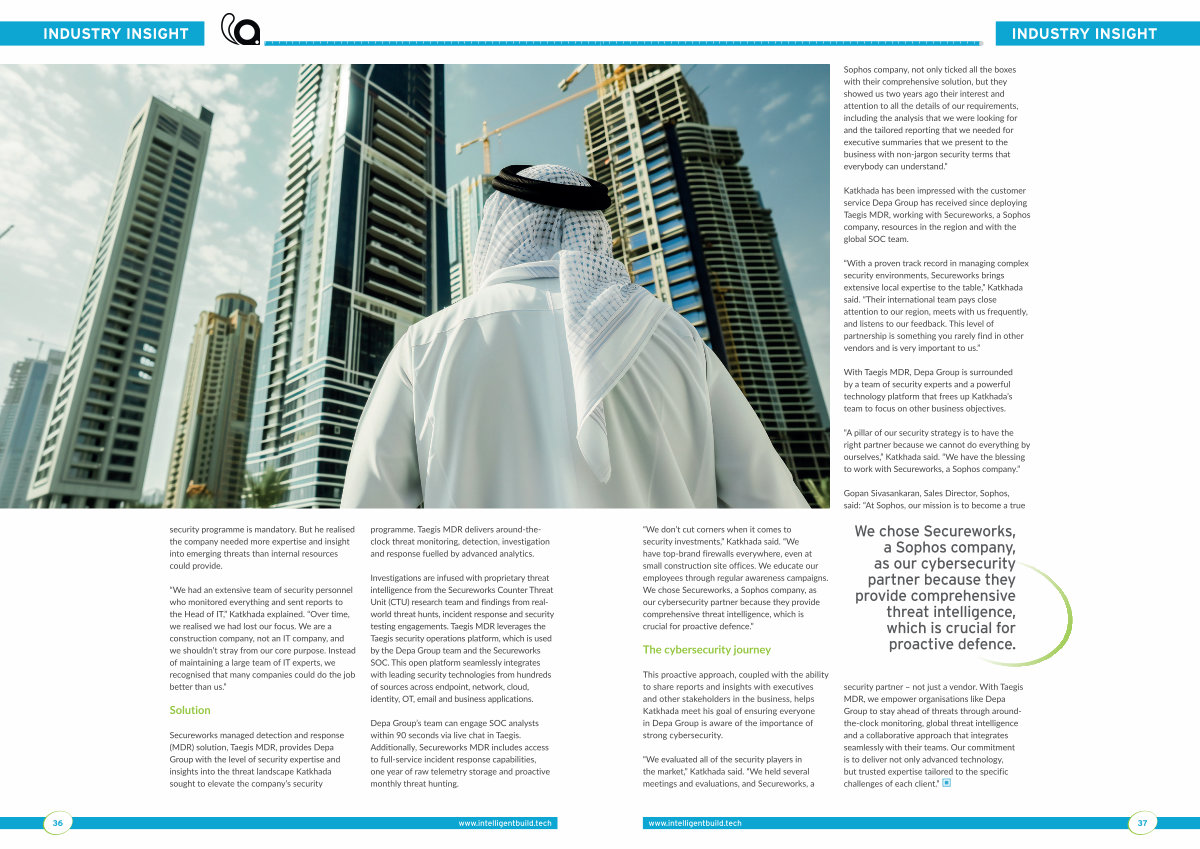 Secureworks managed detection and response( MDR) solution, Taegis MDR, provides Depa Group with the level of security expertise and insights into the threat landscape Katkhada sought to elevate the company’ s security programme. Taegis MDR delivers around-theclock threat monitoring, detection, investigation and response fuelled by advanced analytics.